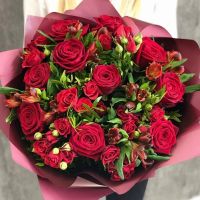 Состав букета 10 роз, 5 кустовых роз, 3 писташи.