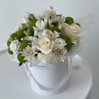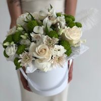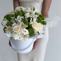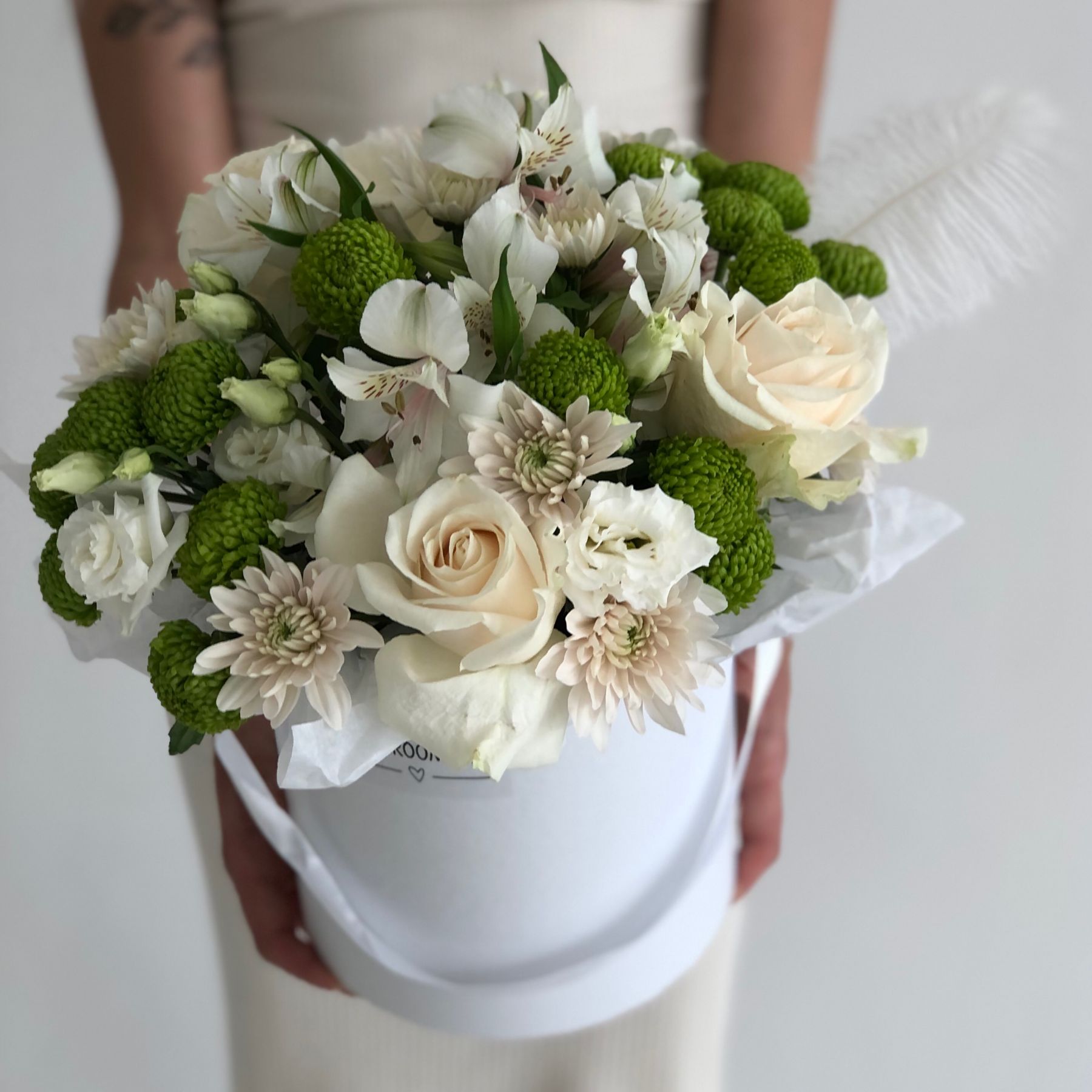 Сборная шляпная коробка в бело-зеленой гамме. В составе: розы, эустомы, альстромерии, хризантемы, декоративное перышко.